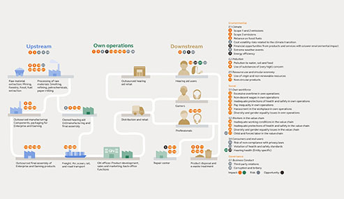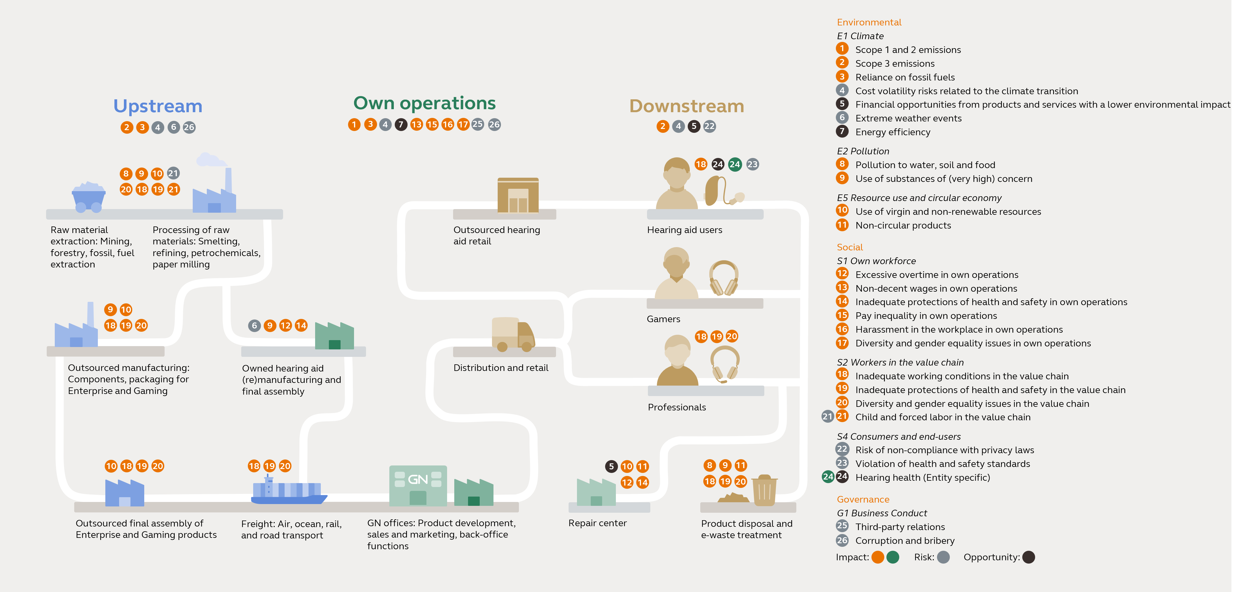 In 2025, we updated our double materiality process to determine material ESG impacts, risks and opportunities for GN across our value chain. See an overview of the impacts, risks and opportunities below.