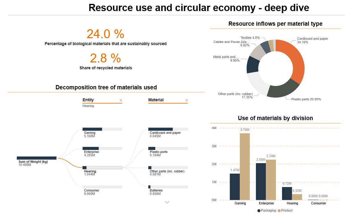 Since 2021, we have worked towards a voluntary design target: for all newly developedproducts, at least 50% of the total weight of mechanical parts (such as plastics,metals, fabrics and other non‑electronic components) should be made from recycled orrenewable materials, unless this is not feasible for technical or business reasons. This requirement is integrated into our product development process so that new products areassessed against it before launch.